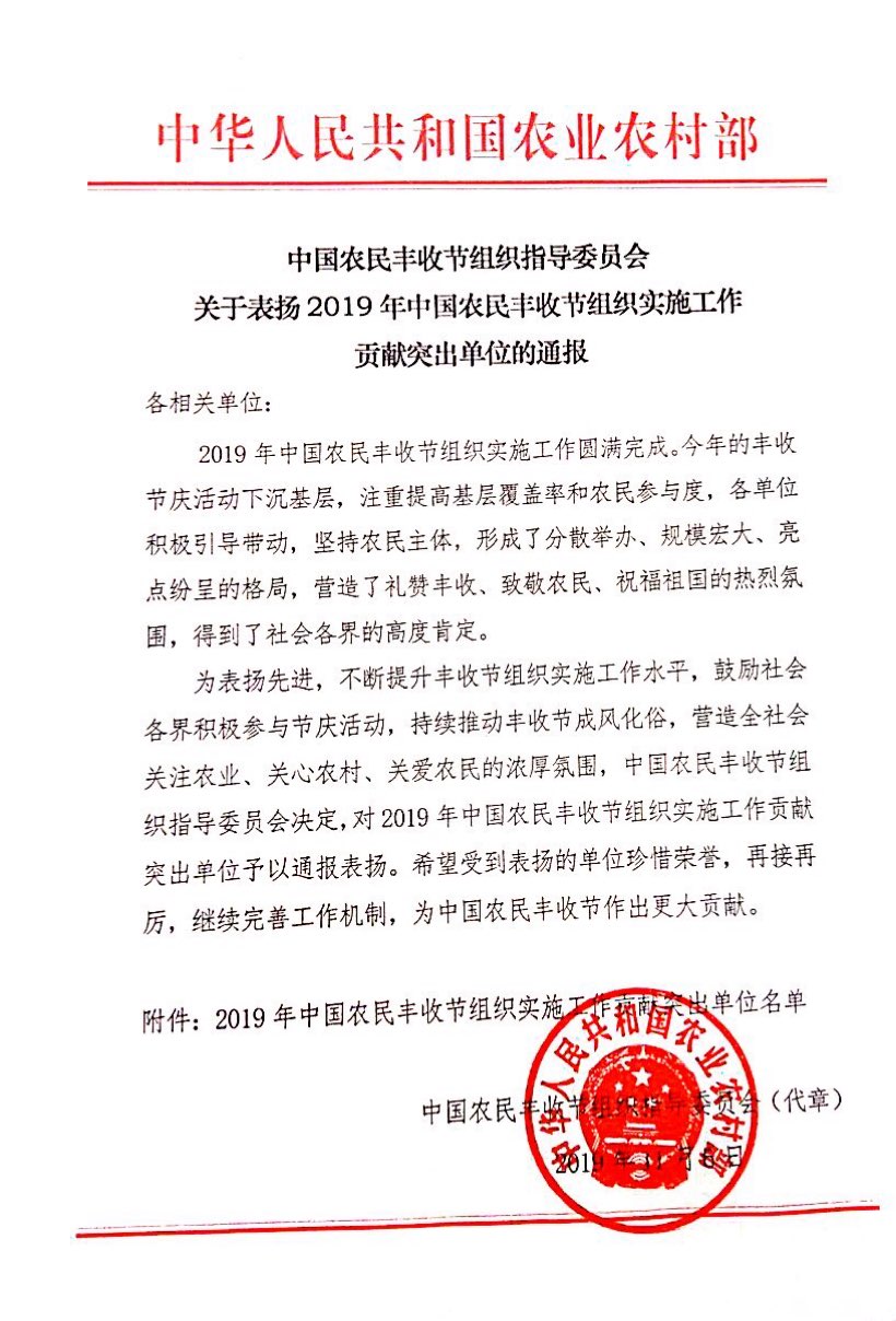 農交會期間,中國農民豐收節組織指導委員會通報了一批2019年中國農民豐收節組織實施工作貢獻突出單位,拼多多、中國銀聯、中國電信等企業獲得表彰。