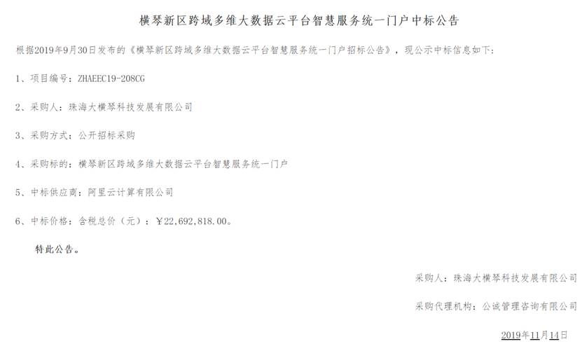 速途網11月20日消息(報道:李楠)近日,珠海產權交易中心網站公布信息顯示,阿里云中標橫琴新區跨域多維大數據云平臺智慧服務統一門戶,采購人為珠海大橫琴科技發展有限公司,項目金額為22,692,818.00元。此前,阿里云還中標了橫琴新區的跨域多維大數據云平臺基礎組件采購項目,項目金額為90,918,573.23元,兩項總計1.13億元。