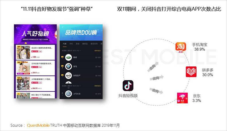 以短視頻APP抖音為例,雙11前夕,抖音加大種草標簽的推薦力度,以短視頻內容形式進行雙11必買榜、熱門商品等推薦,為電商平臺引流效果顯著。報告顯示,今年雙11期間,用戶關閉抖音APP后,去向手機淘寶的次數占比為38.9%,去向拼多多的占比為30%。