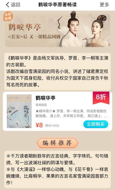 目前,書旗小說APP已經上架《鶴唳華亭》的原著小說,還推出了8折看書的限時優惠。有書旗網友表示,電視劇的更新有點慢,等不及要先看小說的大結局了。