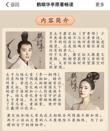由原著作者雪滿梁園親自擔任《鶴唳華亭》劇版編劇,雖然情節上與小說有很大的改動,但仍保留了小說的風格和格調。