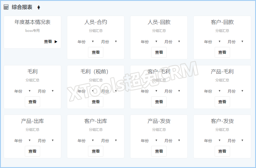 此外,還有毛利、出庫、發貨、合約、回款、采購、采購產品等數據的分組匯總,查詢數據操作快捷,可按照年、月查詢。