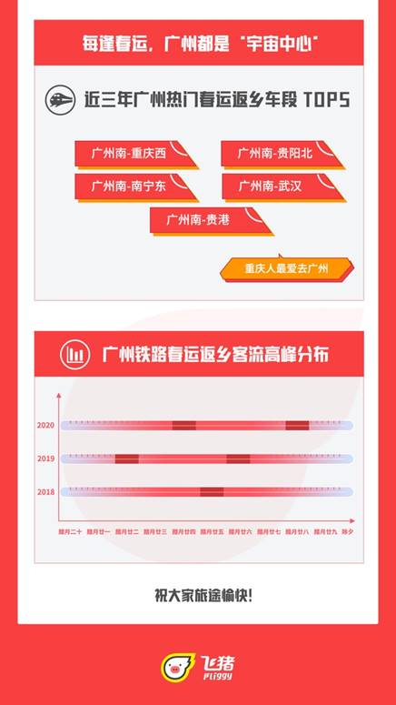 速途網12月24日消息(報道:李楠)今日,農歷臘月二十八(1月22日)的火車票開售,返鄉高峰的“搶票大戰”迎來關鍵時刻。由于工作繁忙、請假不便等因素,大部分上班族會在過年前幾天踏上返鄉旅程。飛豬火車票購票及預約數據顯示,返鄉高峰的TOP10熱門車段,始發站被北京、上海、廣州、深圳四城占據。返鄉高峰期間,廣州南站和白云機場的購票量均為最高,廣州將成為2020年春運大樞紐,而從廣州出發返鄉數量最多的,是飲食差異最大的重慶人。