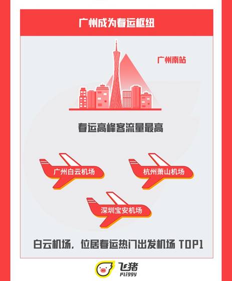 春運期間的白云機場不輸廣州南站,同樣是繁忙度NO.1。從飛豬平臺機票預訂情況來看,春運期間最熱門的TOP3出發機場依次為廣州白云機場、杭州蕭山機場和深圳寶安機場。