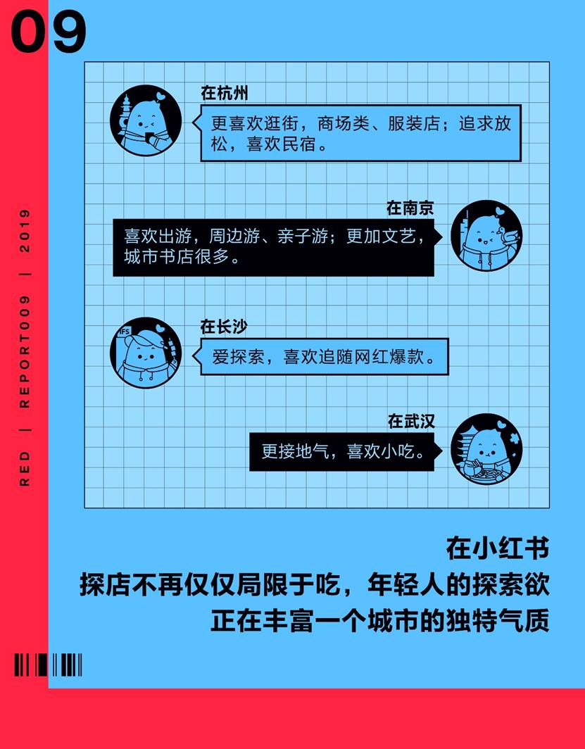 報告還顯示,在小紅書上成為潮流的“探店”形式正在發(fā)生一些改變,各個城市年輕人的探店愛好已經不再僅僅局限于美食。在杭州,創(chuàng)作者們更愛逛街打卡商場和服裝店,也愛追求放松,探尋一些民宿;在南京,創(chuàng)作者們喜歡周邊游,以及去城市書店;在長沙,小紅書創(chuàng)作者們追尋著網紅爆款打卡地;在武漢的創(chuàng)作者們,則在一遍遍地探尋這座城市最迷人的街邊小吃。