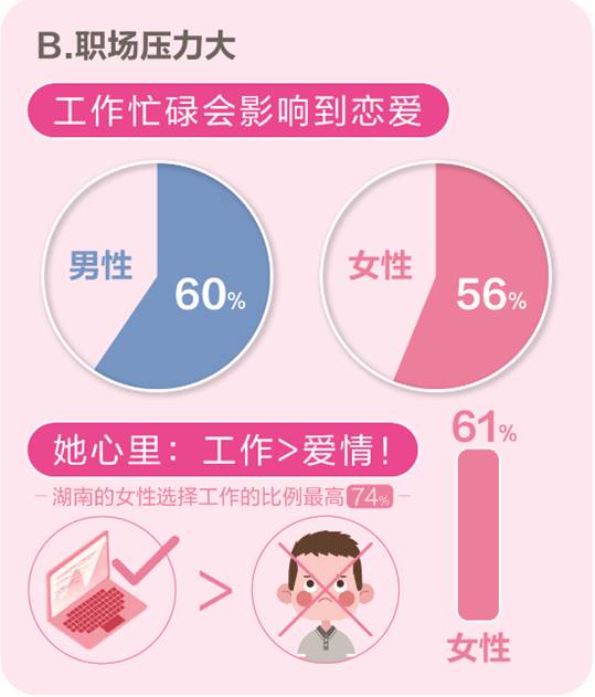 “工作忙”目前已成為很多當代職場人戀愛路上的絆腳石。調查顯示,大部分男性和女性都認為“工作忙碌會影響戀愛”,主要覺得受影響的方面是沒精力,沒時間見面和交流。當工作與戀愛出現沖突的時候,男女有何不同的選擇呢?超六成女性優先選擇了工作,其中74%的湖南女性選擇工作的比例最高;而大部分男性會優先選擇愛情,男性雖然嘴上說著工作與戀愛有沖突時,會優先選擇愛情,但在現實中,曾因工作忙碌疏忽戀人的比例達到80%,隨著收入的上升,比例也在逐漸升高。