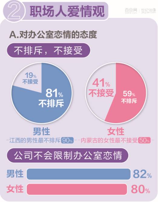忙碌的職場人沒有時間社交,在讓人難以接受辦公室戀情的諸多原因中,單身們首選的是不希望戀愛和工作相互影響,另外也擔心如果分手了相處會尷尬。雖然同事朝夕相處,但面對敏感的辦公室戀情,四成女性表示不能接受,比例遠高于男性;超八成男性表示不排斥,其中90%的江西男性最不排斥;工作年限在1-5年的單身男性,對辦公室戀情接受的比例最高;八成單身表示,所在單位實際并未對辦公室戀情做出限制,而對于某些公司限制辦公室戀情的做法,男性比女性更排斥。