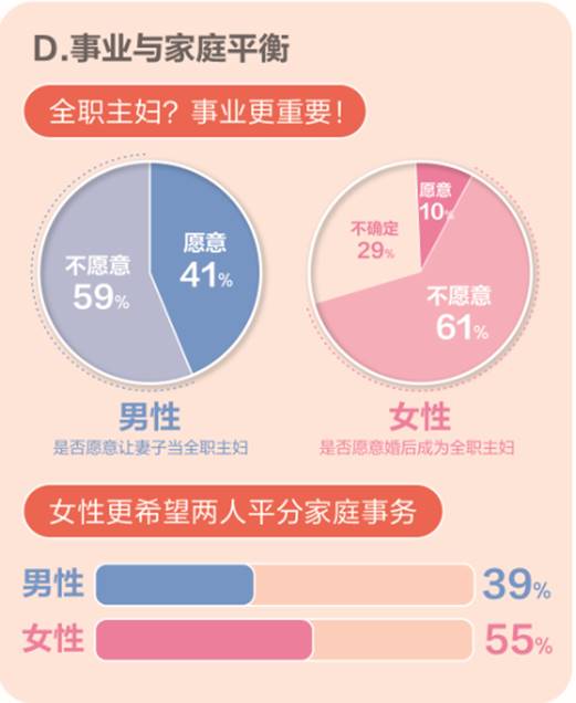 對戀人的工資要求雖高,但女性們對戀人的工資卡態度卻很含蓄,超七成女性表示“對方給就收著,但自己不會主動要”;而學歷越高,對方給也不要的比例越高。對于是否辭職做全職主婦,男女態度則表示一致。近六成男性不愿意自己的妻子做全職主婦,主要原因是“不希望對方脫離社會”;六成女性也明確表示不愿意當全職主婦,主要原因是“希望有自己的事業和收入”。