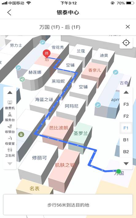 得益于室內地圖在喵街的應用,銀泰百貨和品牌商家可以實時了解商場結構、品牌組合、鋪位狀態,并對其進行數字化管理。這項功能還為消費者在商場內找專柜、母嬰室、電梯等提供便利,同時快速路線規劃和導航指引。
