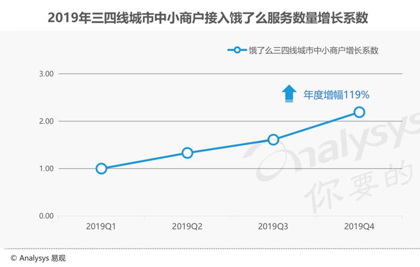 《報告》顯示,2019Q4外賣活躍用戶數在全網滲透率為13.4%。業內分析認為,三四線城市潛力巨大。隨著即時配送、移動支付等基礎設施的完善,本地生活服務的規模效應凸顯。越來越多的三四線城市中小商戶開始尋求線上線下融合的新模式,2019年接入餓了么口碑數字化服務的商戶數翻了一倍。