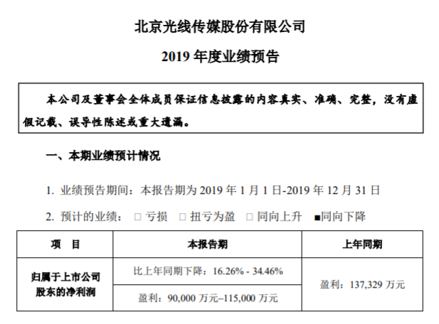 速途網訊 昨日,光線傳媒發布公告稱:2019年預計盈利9億-11.5億元,同比下降16.26%-34.46%。光線傳媒表示,電影業務利潤較上年同期大幅增加,主要是報告期內投資、發行或協助推廣的影片《瘋狂的外星人》《千與千尋》《哪吒之魔童降世》《我和我的祖國》《誤殺》等取得了優異的票房成績,公司電影業務收入增加所致。