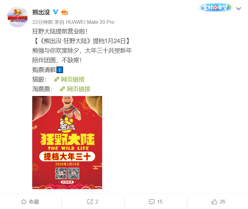 《熊出沒·狂野大陸》宣布提檔至大年三十 仙雯 ? 2020年1月20日 16:47 ? 電影 速途網訊 今日下午,熊出沒官方微博發博表示,《熊出沒·狂野大陸》提檔至1月24日,與用戶歡度除夕。 贊 (0) 仙雯 0 生成海報 中國A股市場首家同股不同權 云計算第一股優刻得登陸科創板 上一篇 2020年1月20日 16:25 維信諾:預計2019年實現凈利潤同比增長58.78%-136.72% 下一篇 2020年1月20日 17:05