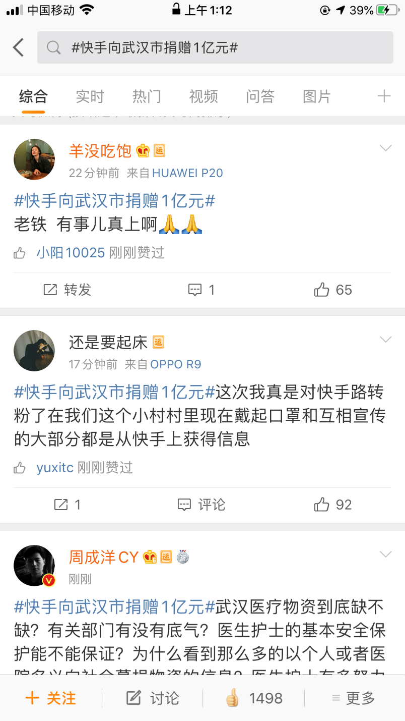 人民日報等主流媒體于1月23日發(fā)布推送,點贊了快手的捐款行為:“老鐵們,必須給快手贊了!快手科技向武漢捐贈1億元,用于抗擊疫情!”