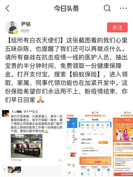 速途網今日從阿里巴巴獲悉,看到醫(yī)生發(fā)出的呼吁后,支付寶保險平臺的工作人員已經連夜為全國醫(yī)護人員設立了“健康保障金”。在國家衛(wèi)健委公告認定的疫情期間,如果醫(yī)護人員在抗擊疫情中不幸感染新型冠狀肺炎,確診后可申請10萬保障金;如果不幸因病身故,可申請50萬保障金。