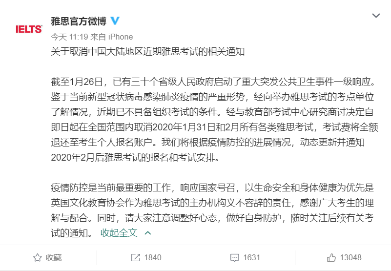@雅思官方微博 稱,經與教育部考試中心研究商討決定自即日起在全國范圍內取消2020年1月31日和2月所有各類雅思考試,考試費將全額退還至考生個人報名賬戶。我們將根據疫情防控的進展情況,動態更新并通知2020年2月后雅思考試的報名和考試安排。