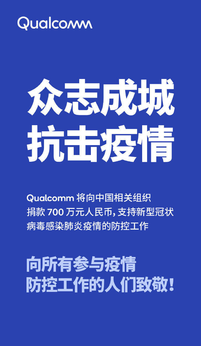 高通中國捐款700萬元 支持疫情防控 李楠 ? 2020年1月29日 13:07 ? 5G, 快訊 速途網(wǎng)訊 今日,高通(Qualcomm)中國宣布,將向中國相關組織捐款700萬元人民幣,支持新型冠狀病毒感染肺炎疫情的防控工作。(李楠) 贊 (0) 李楠 0 生成海報 從快手漫游到武漢同城,你會看到什么? 上一篇 2020年1月29日 13:03 抗擊疫情24小時直播,阿里“疫情服務直通車”新增辟謠、尋人等功能 下一篇 2020年1月29日 14:00