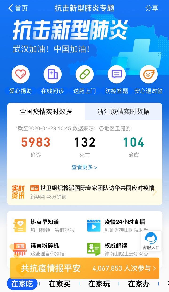 阿里巴巴的“疫情服務(wù)直通車”自上線以來,因匯總了各項不用出門也能享受到的6類服務(wù):“問查看吃買辦”,包括在線問診和送藥上門等,能減少大家出門的次數(shù),廣受歡迎。在支付寶App首頁腰封位置,或上支付寶搜“抗擊疫情”便能進入該頁面。
