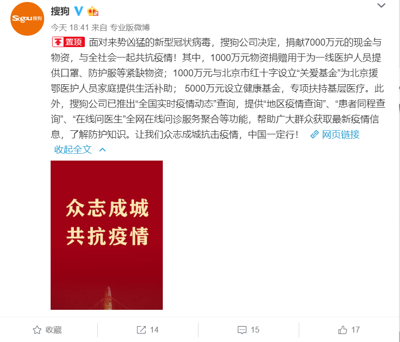 速途網訊 今日,搜狗公司宣布捐獻7000萬元的現金與物資,與全社會一起共抗疫情。據悉,1000萬元物資捐贈用于為一線醫護人員提供口罩、防護服等緊缺物資;1000萬元與北京市紅十字設立“關愛基金”為北京援鄂醫護人員家庭提供生活補助; 5000萬元設立健康基金,專項扶持基層醫療。此前,搜狗公司已推出“全國實時疫情動態”查詢,提供“地區疫情查詢”、“患者同程查詢”、“在線問醫生”全網在線問診服務聚合等功能,幫助廣大群眾獲取最新疫情信息,了解防護知識。(李楠)