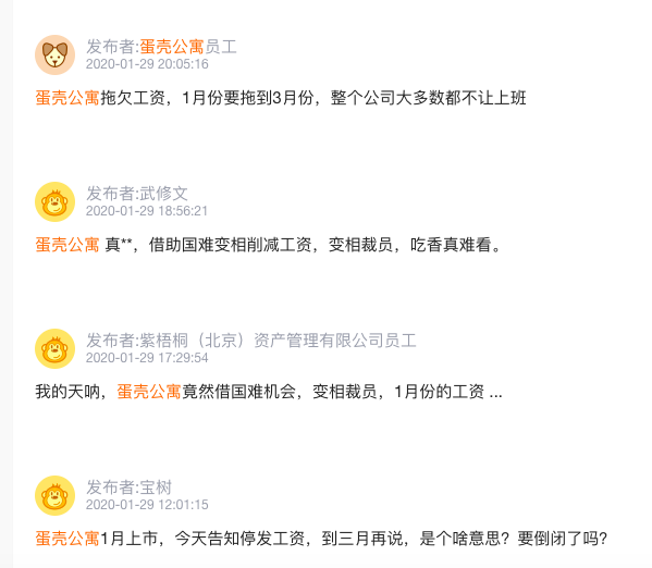 在脈脈上,認證為蛋殼公寓員工的發布者從1月29日時便接連表示,蛋殼公寓拖欠工資,同時借疫情變相裁員。