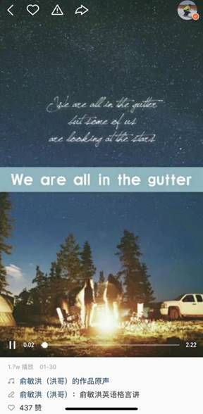 “We are all in the gutter, but some of us are looking at the stars.”俞敏洪用自己漂亮的英式發(fā)音念出了王爾德的這句名言。緊接著,他向網(wǎng)友們解釋了這句話的意思:“翻譯成中文就是,盡管我們都身在溝渠,但總有些人會仰望星空。”還介紹了更加文雅的翻譯;“身在井隅,心向璀璨。”瞬間讓人體會到了中英文之美。