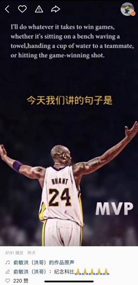 科比是俞敏洪喜歡的籃球隊員,也是他兒子的偶像。在得知科比去世是消息后,俞敏洪的眼淚一下涌上了眼眶,嗓子也哽得說不出話。為此,他拍攝了一條講解科比的名言的短視頻,紀念科比。