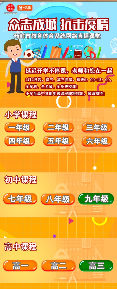 全民抗擊新型冠狀病毒肺炎疫情時,全國各級教育部門也在全力防控。教育部日前下發通知,要求全國大中小學2020年春季學期延期開學。在此背景下,為了最大限度減少延期開學對正常教育教學的影響,快手聯合開封市教育體育局推出針對全市中小學生的網絡直播課堂,通過快手直播間為全市廣大中小學生提供在線教育教學服務。