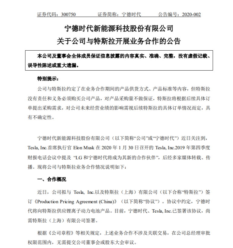 速途網(wǎng)訊 今日,寧德時(shí)代發(fā)布公告稱,公司擬與特斯拉簽訂協(xié)議,將向特斯拉供應(yīng)鋰離子動(dòng)力電池產(chǎn)品,最終銷售金額須以特斯拉發(fā)出的采購(gòu)訂單實(shí)際結(jié)算為準(zhǔn)。