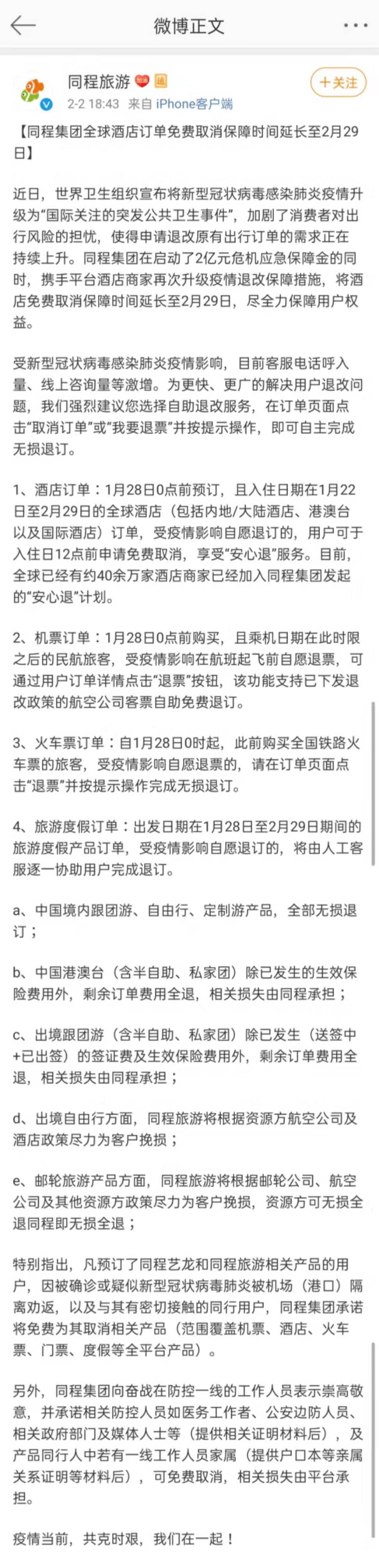 速途網訊 日前,同程集團在啟動了2億元危機應急保障金的同時,攜手平臺酒店商家再次升級疫情退改保障措施,將酒店免費取消保障時間延長至2月29日。另外,同程集團表示,受新型冠狀病毒感染肺炎疫情影響,目前客服電話呼入量、線上咨詢量等激增。為更快、更廣的解決用戶退改問題,平臺強烈建議用戶選擇自助退改服務,在訂單頁面點擊“取消訂單”或“我要退票”并按提示操作,即可自主完成無損退訂。