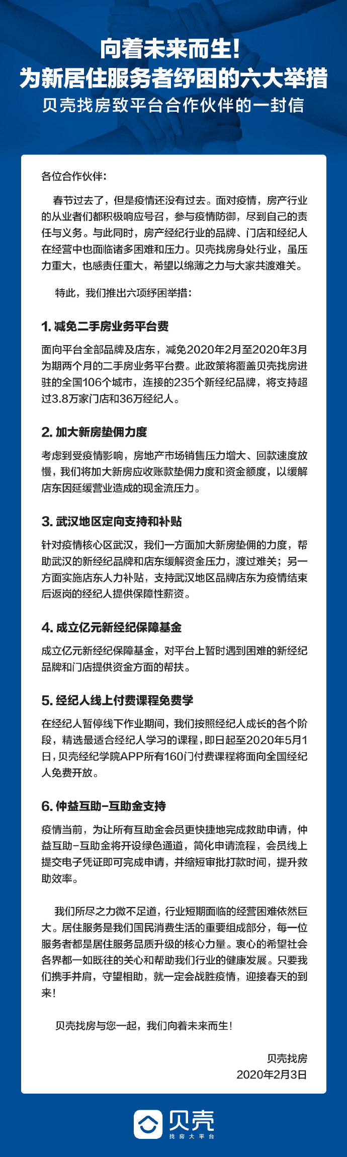 速途網(wǎng)訊 今日,貝殼找房發(fā)布致平臺(tái)合作伙伴的一封信,推出六項(xiàng)紓困舉措,包括減免二手房業(yè)務(wù)平臺(tái)費(fèi)、加大新房墊傭力度、武漢地區(qū)定向支持和補(bǔ)貼、成立億元新經(jīng)紀(jì)保障基金、經(jīng)紀(jì)人線上付費(fèi)課程免費(fèi)學(xué)、提供仲益互助-互助金支持。
