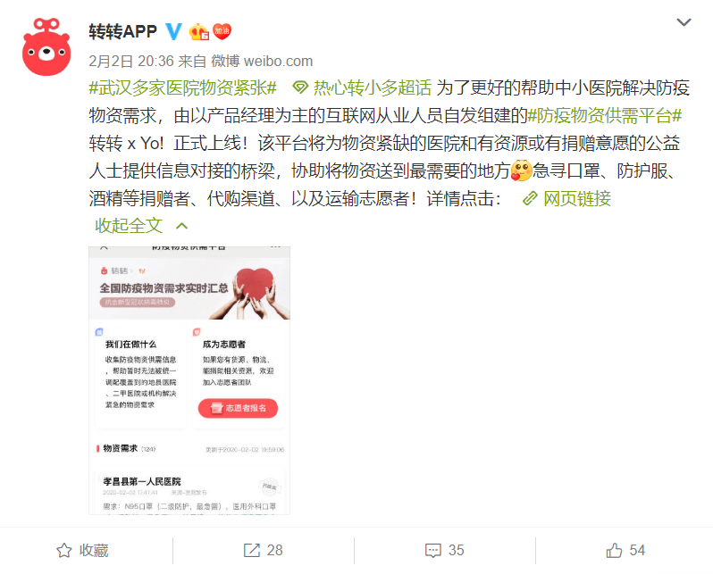 速途網訊 昨日,轉轉聯合多個志愿者組織匯聚供需信息、物流能力,并提供技術支持的線上防疫物資供需平臺“轉轉x Yo!”正式上線。“轉轉x Yo!”作為線上平臺,主要用于實時收集防疫物資供需信息,重點面向目前暫時無法被統一調配覆蓋到的地縣醫院、二甲以下中小醫院或機構等。