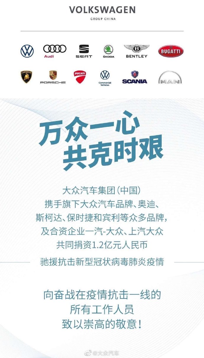 速途網(wǎng)訊 今日,大眾汽車集團(tuán)(中國(guó))聯(lián)合旗下大眾汽車品牌、奧迪、斯柯達(dá)、保時(shí)捷和賓利等品牌,及合資企業(yè)一汽-大眾、上汽大眾共同捐資1.2億元人民幣馳援抗擊新型冠狀病毒肺炎疫情。(李楠)
