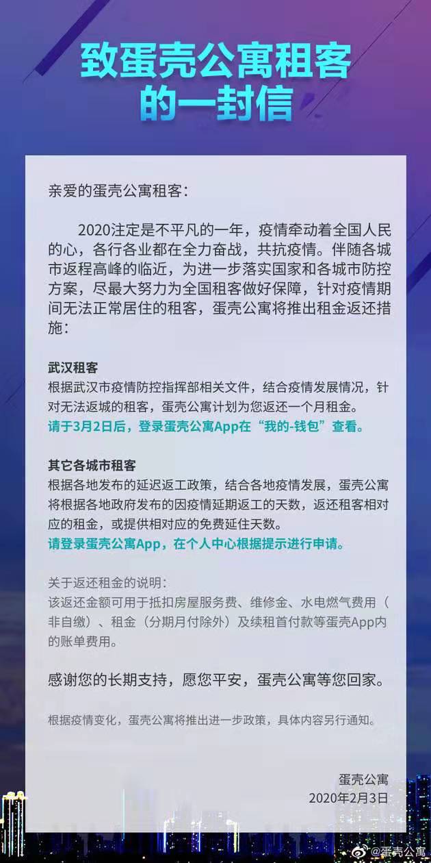 速途網2月3日消息(報道:吳佳馨)今日,蛋殼公寓發布至蛋殼公寓租客的一封信,信中稱,蛋殼公寓為進一步落實國家和各城市防控方案,盡最大努力為全國租客做好保障,針對疫情期間無法正常居住的租客,將推出租金返還措施。