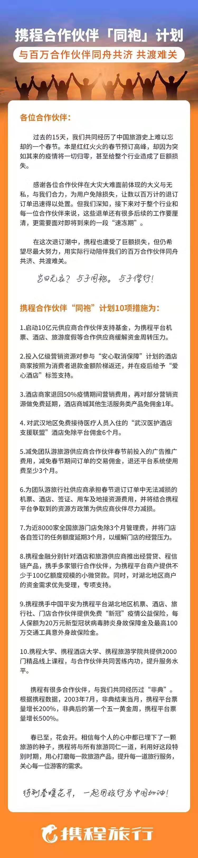 速途網(wǎng)訊 今日,攜程向其平臺上的機(jī)票、酒店、旅游度假等領(lǐng)域合作伙伴宣布推出“同袍”計劃,包括9項具體措施,投入10億元合作伙伴支持基金和100億元額度小微貸款。酒店方面,攜程將投入億級營銷資源和專屬標(biāo)簽回饋“安心取消保障”計劃參與酒店,并對部分酒店及產(chǎn)品傭金給予6個月至12個月的減免措施。