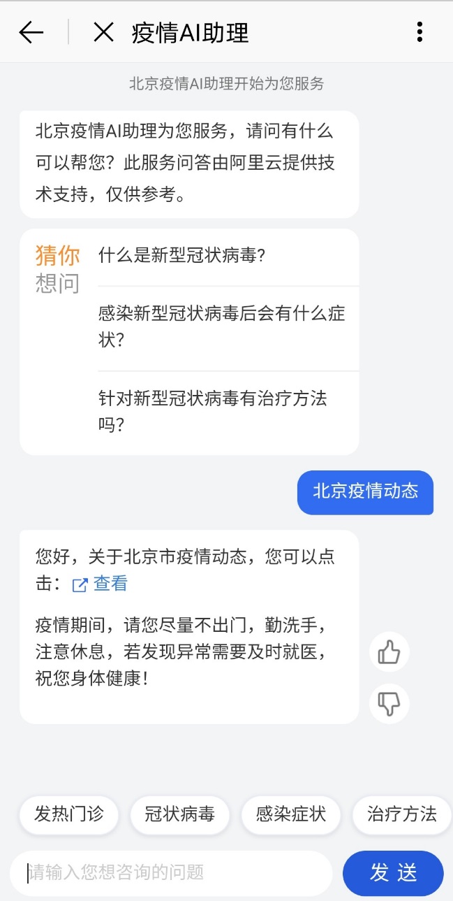 “智能疫情機器人”為廣大用戶提供在線咨詢,并及時提供官方權威信息。頁面有當前咨詢熱點問題,以及常用工具和熱線號碼提示,幫助市民對疫情最新信息、熱點信息一覽無余。此外包括 “發熱門診”“北京疫情動態”“全國疫情動態”“冠狀病毒”“治療方法”“就醫指南”“如何預防”“智能問診”等版塊,提供最新資訊。
