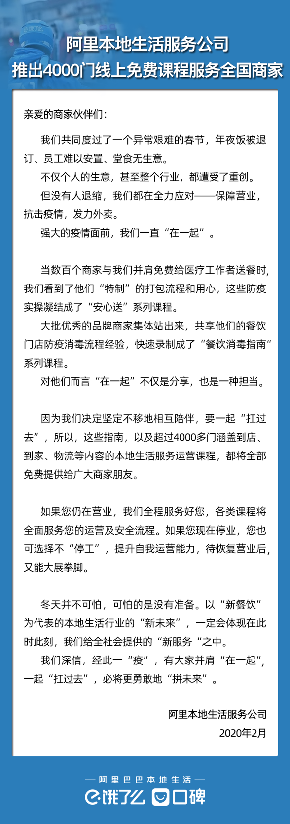 “這些課程和服務,我們將全部免費贈送給商戶無償使用”,阿里本地生活服務公司首席人力資源官姜蓮華表示,“越是困難時期,平臺就要更堅定的和商戶‘在一起,扛過去,拼未來’。”