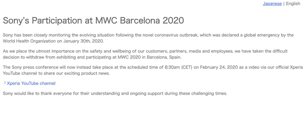 索尼宣布退出MWC 2020展會 仙雯 ? 2020年2月10日 19:04 ? 快訊, 科技 速途網訊 據新浪數碼報道,索尼在一份聲明中表示,決定退出西班牙巴塞羅那舉行的MWC 2020展會。此前,LG電子、愛立信、英偉達和亞馬遜已經選后宣布退出MWC2020展會。 索尼 贊 (0) 仙雯 0 生成海報 蔚來汽車1月份交付1598輛汽車 上一篇 2020年2月10日 19:02 OPPO陳明永:疫情帶來的暫時的困難,不會削減戰斗力 下一篇 2020年2月10日 19:45