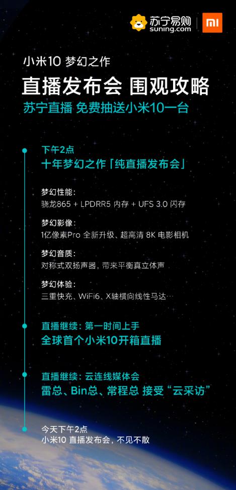 2月13日14時,小米10旗艦新品將在蘇寧直播以“云發布會”形式在線發布,屆時雷軍將出席發布會,為大家帶來包括小米10在內的多款新品。