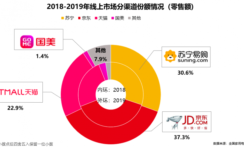 在線上市場,蘇寧、京東、天貓瓜分了90.8%的市場份額。其中,蘇寧線上渠道增速高于行業平均,消費習慣決定了消費者在不同電商平臺購買家電產品的喜好。