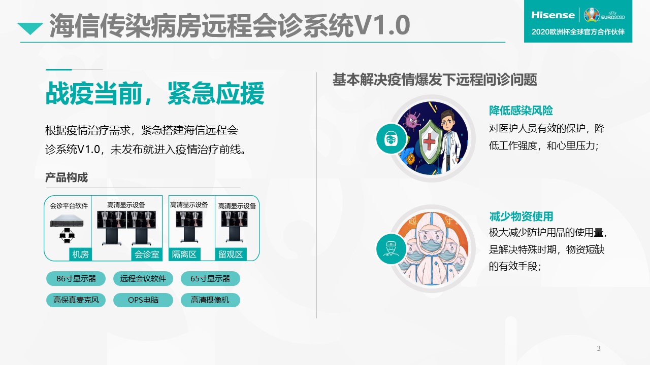 在抗擊疫情過程中,海信在1月23日(臘月二十九)早上,收治山東首例新冠肺炎患者的青島大學附屬醫院向我們發出了救援信息,希望能夠緊急搭建一套隔離病房的視頻會診系統,他們下午3點要組織專家對患者進行會診。收到需求后,我們迅速組成海信醫療設備公司與青大附院協同小組。在5個小時之內緊急搭建完成了遠程會診系統。這套系統可以對接病房,又可以對接遠程會診中心和專家辦公室,同時可與上下級醫院隨時溝通,專家不用進入病房就可以清楚地看見病人的舌苔,檢查病人的病情和各項特征,并可以隨時召集各方專家進行會。
