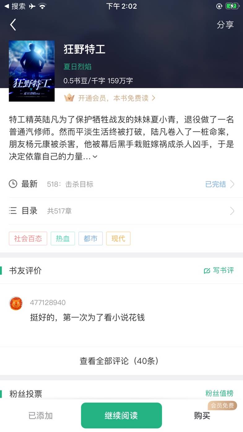 很多讀者在看完這部小說后認為,《狂野特工》不是一部靠賣慘博眼球的小說,書中除了緊張刺激的“追龍”式破案情節,還有相當多的幽默橋段和生活氣息,符合當下年輕人讀者的閱讀習慣。