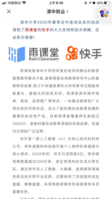 據(jù)了解,今年2月,清華大學(xué)主辦的在線教育平臺(tái)“學(xué)堂在線”與快手科技達(dá)成戰(zhàn)略合作。雙方將在教學(xué)內(nèi)容共享、直播技術(shù)合作等多個(gè)方面開展深層次合作,共同促進(jìn)教育普惠。