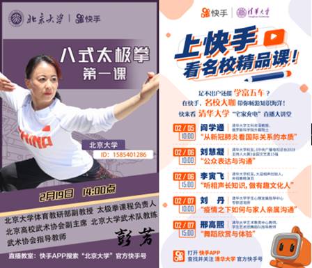 2月份以來,清華大學、北京大學、復旦大學、浙江大學、北京師范大學等數十所頂尖高校紛紛做了同一件事,與快手等短視頻+直播平臺合作,開展在線直播或錄播的“高校精品課”,推進知識共享和教育普惠。