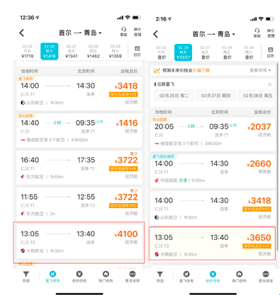 “不過,這一價格在半小時后就已看不到,目前2月25日尚有一班晚上9點起飛的航班,最低含稅價格在3400元左右。”去哪兒網相關負責人分析。通過去哪兒網平臺搜索,2月26日、27日起飛的該航線航班,能夠購買到低于2000元的含稅直飛機票。