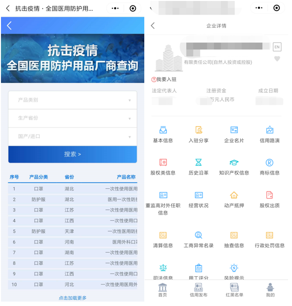 同時,為方便各醫院、企業及群眾采購到正規廠商生產的疫情防控物資,用戶還可以通過“全國醫用防護用品廠商查詢服務”功能查詢物資是否正規,醫用口罩、消毒液、面罩、防護服等都可在此查詢廠商資質與聯系方式。