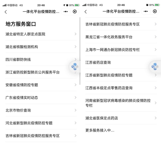 地方服務窗口專題已連接16個地方專項小程序,包括北京物價查詢、浙江省防控新型肺炎公共服務平臺、四川省群防快線、湖北省醫保指定藥店、湖北省核酸檢測機構、廣東省疫情實時動態、安徽省疫情防控專題、河北省新型肺炎疫情防控專題、吉林省新型肺炎疫情防控專區、黑龍江省一體化政務服務平臺、上海市一網通辦新冠肺炎防控專欄、江蘇省藥店查詢、江西省本級定點零售藥店查詢、河南省新冠病毒感染的肺炎疫情防控專欄等,為各省及地市群眾提供快捷服務入口。