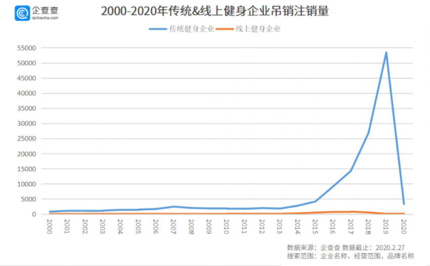 比起火熱的線上健身,線下健身在經(jīng)歷了前幾年的寒冬后,又因疫情遭受了“滅頂之災(zāi)”。據(jù)企查查顯示,傳統(tǒng)健身企業(yè)的注銷數(shù)量自2013年開(kāi)始直線上升,2019年達(dá)到達(dá)到峰值,為53430家,2020年1月至2月疫情期間,傳統(tǒng)健身企業(yè)又相繼注銷了3295家,比2014年一整年的數(shù)量都多。