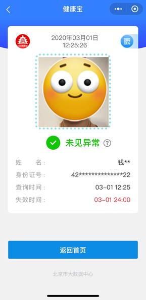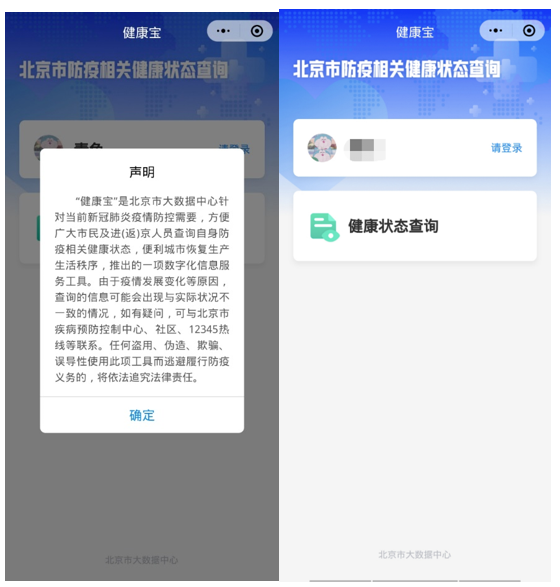 北京市民及進(返)京人員可通過小程序自查自身狀態,查詢結果會以健康證的形式呈現,作為其復工復產、出入社區等場景的健康狀態標識。