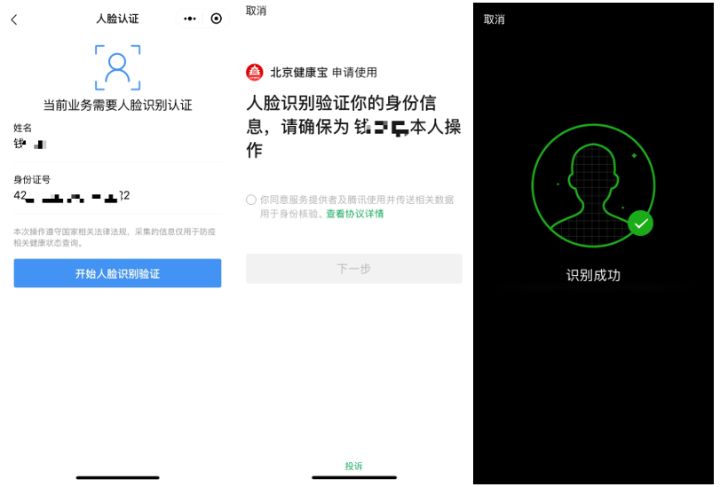 具體而言,北京市民及進(返)京人員需要通過“北京健康寶”小程序進行實名認證。市民只需輸入姓名和身份證號之后進行人臉識別認證,即可實現登錄。人臉比對的認證方式能夠確保個人健康信息真實、準確、有效,且不被冒用。