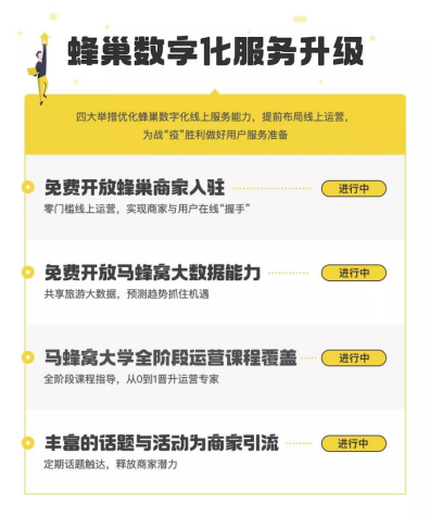 蜂巢智能化服務系統自2019年6月發布以來,已經幫助眾多合作伙伴實現零門檻開展線上運營工作,無論是傳統旅游企業的線上運營探索,還是新型旅游企業的線上資產提升,都能夠通過該系統找到高效有用的路徑與方法。此次系統升級后,馬蜂窩將與所有入駐商家共享平臺旅游大數據,也將開展更加豐富的話題和運營活動,幫助不同類型、不同需求的合作伙伴提升線上運營能力,并結合馬蜂窩大學疫情期間的運營課程,幫助旅游企業在疫情期間修煉內功,精細化打磨服務及產品。