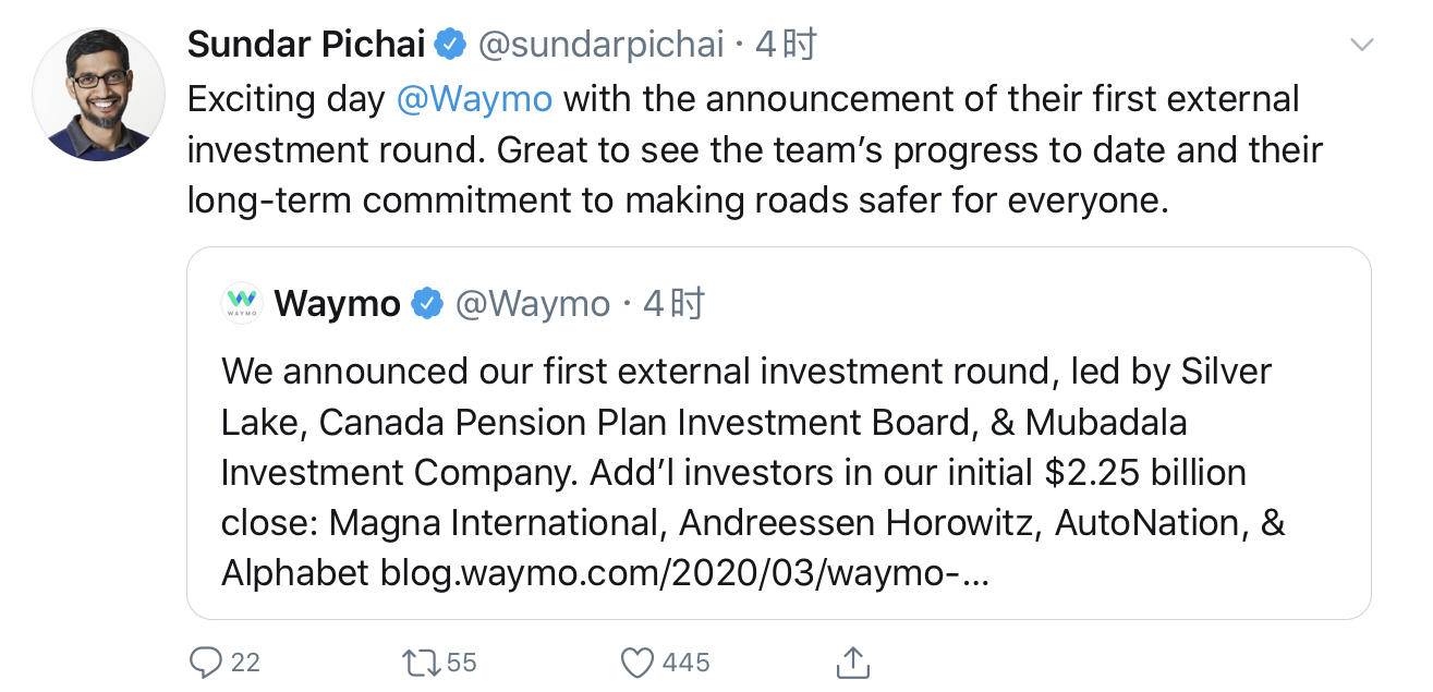 速途網(wǎng)訊 今日,Waymo在推特上宣布,共獲得了22.5億美元(約合人民幣156億元)融資,其中Silver Lake(銀湖資本)、Canada Pension Plan Investment Board(加拿大養(yǎng)老金計劃投資委員會)、Mubadala investment(阿布扎比的主權(quán)財富基金)等公司領(lǐng)投,零部件巨頭麥格納集團、硅谷風投機構(gòu)Andreessen Horowitz、汽車零售巨頭AutoNation和谷歌母公司Alphabet參投。這筆新的投資將用于招募員工、技術(shù)開發(fā)和全球運營。Waymo CEO John Krafcik在推特上表示,銀湖資本和加拿大養(yǎng)老金計劃投資委員會將進入公司董事會。參與投資的麥格納與AutoNation都和Waymo有業(yè)務(wù)往來。